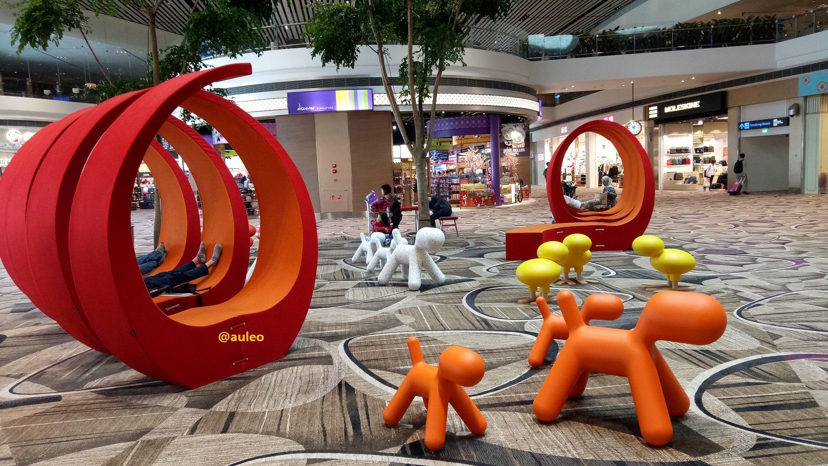 新加坡这一座新机场第四航厦里边还有一个特色,就是它的椅子很多姿多彩,
